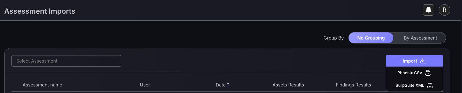 - Select the “Import” button, located on the top right hand side of the page. Then select “BurpSuite XML“.