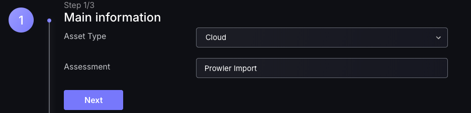 - Select an existing Assessment or create a new Assessment name for these assets and vulnerabilities. An assessment (or engagement) identifies a single or recurring exercise on a consistent set of assets. Examples of Assessment names would be “Red Team”, “Scanner XYZ”, etc. Press “Next” to continue.
