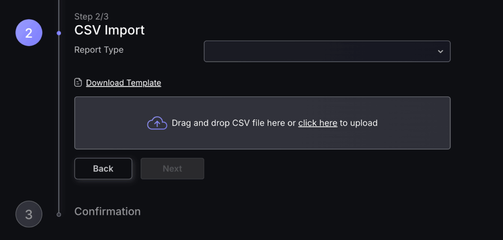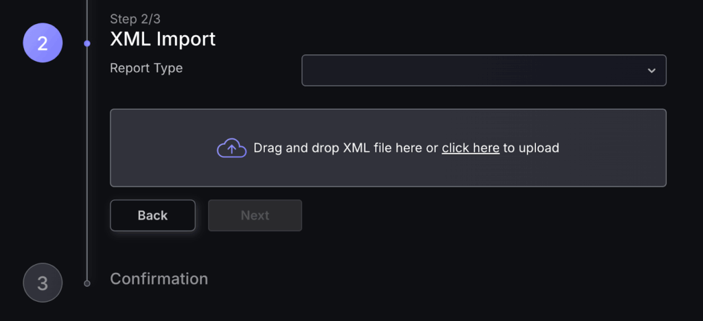 - The next steps are the same for both CSV and XML imports, which is to select the report type and import method. Please refer to the Report Types and Import Methods section of this document for further guidance.