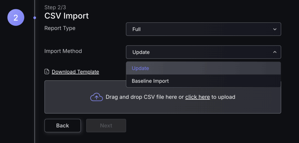 - Baseline Import – This methods removes any vulnerabilities previously imported for this Assessment before uploading the new file. Only use this method if you wish to discard all assets and vulnerabilities in this Assessment or if it is the first upload under this Assessment.