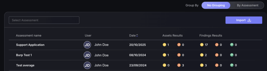 Based on the above definition, repeated scans or tests of the same scope should be imported under the same assessment. This will allow the platform to keep track of changes to assets and vulnerabilities over time.