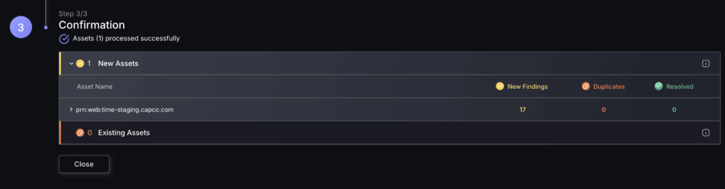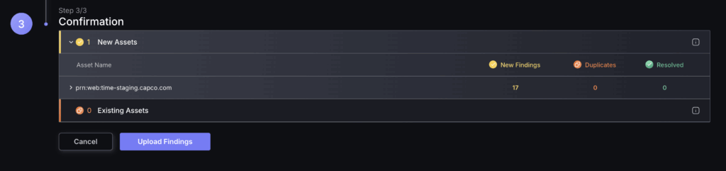 - Once you have made your selection on report type and import method, click “Next“, you will then be given a breakdown of how many Assets and Findings will be created.
