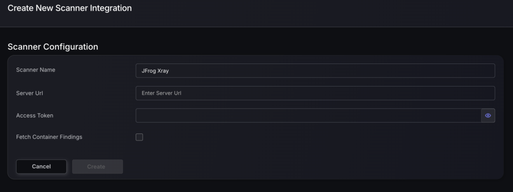 - Next you need to provide the required details for the scanner integration. In the case of JFrog Xray you need to provide: