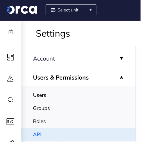 - To create your API Client credentials log into your Orca organisation and on the left-hand menu click on “Settings” then expand “Users and Permissions”.