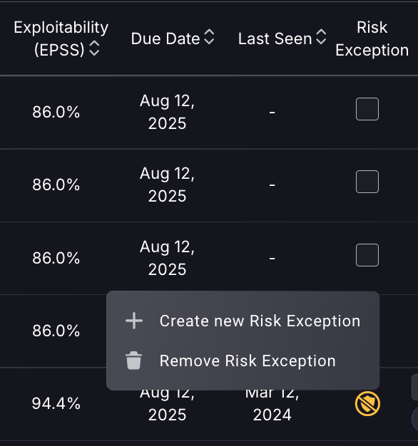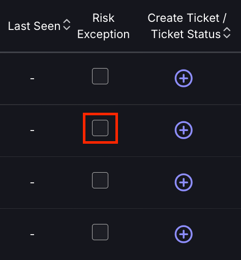 - Navigate to the finding you wish to propose a risk exception to and select the empty grey box in the Risk Exception column of the table. If a finding already has a history of risk exceptions, select the exception icon in the Risk Exception column and then select Create new Risk Exception.