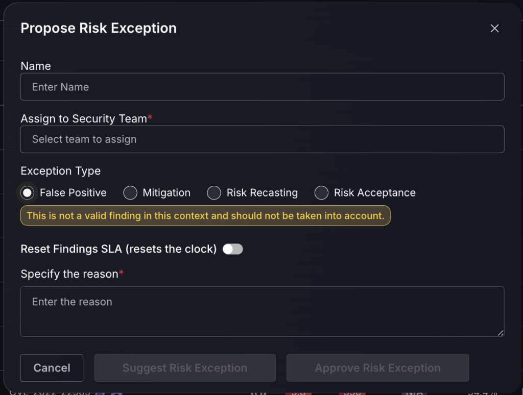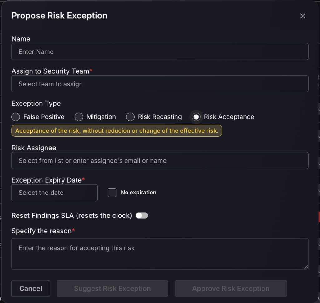 A risk exception is a modification of the risk score or status of a finding. In the Phoenix platform, risk exceptions must always go through an approval process; once a request is made, a member of the security team is required to review, then accept or reject the risk exception request.