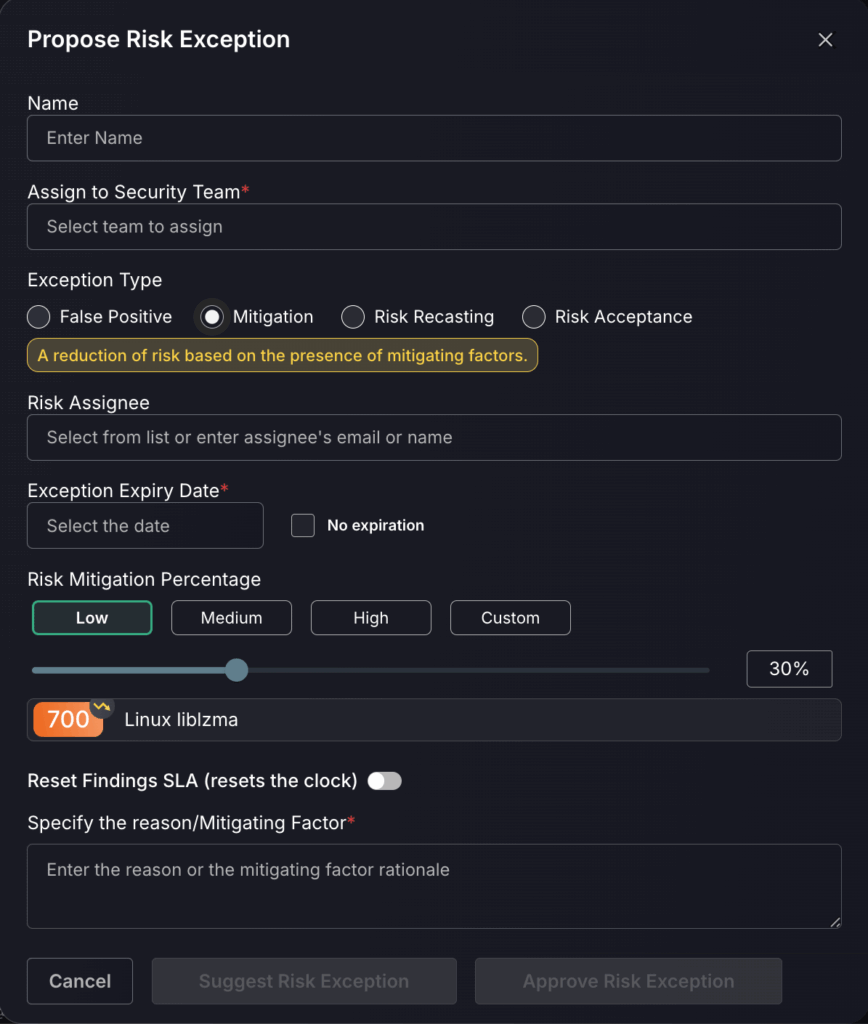 Whilst a risk mitigation is active on a particular finding, the final risk score for the finding would be reduced by the percentage defined in the exception. This reduction is applied dynamically to the latest risk score of the finding. Findings with a risk mitigation of 100% are not displayed in the Open section of the findings page.